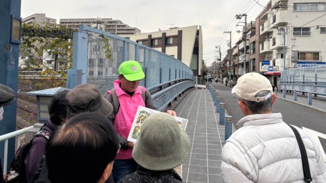巣鴨の創造館ではトイレ休憩をとり、中山道の話を中心に地蔵通りは東京が江戸と言われた頃にたくさんの人が通りました。江戸名所図会の資料を見ながら、街道を通る人々の姿を頭に浮かべてもらいました。