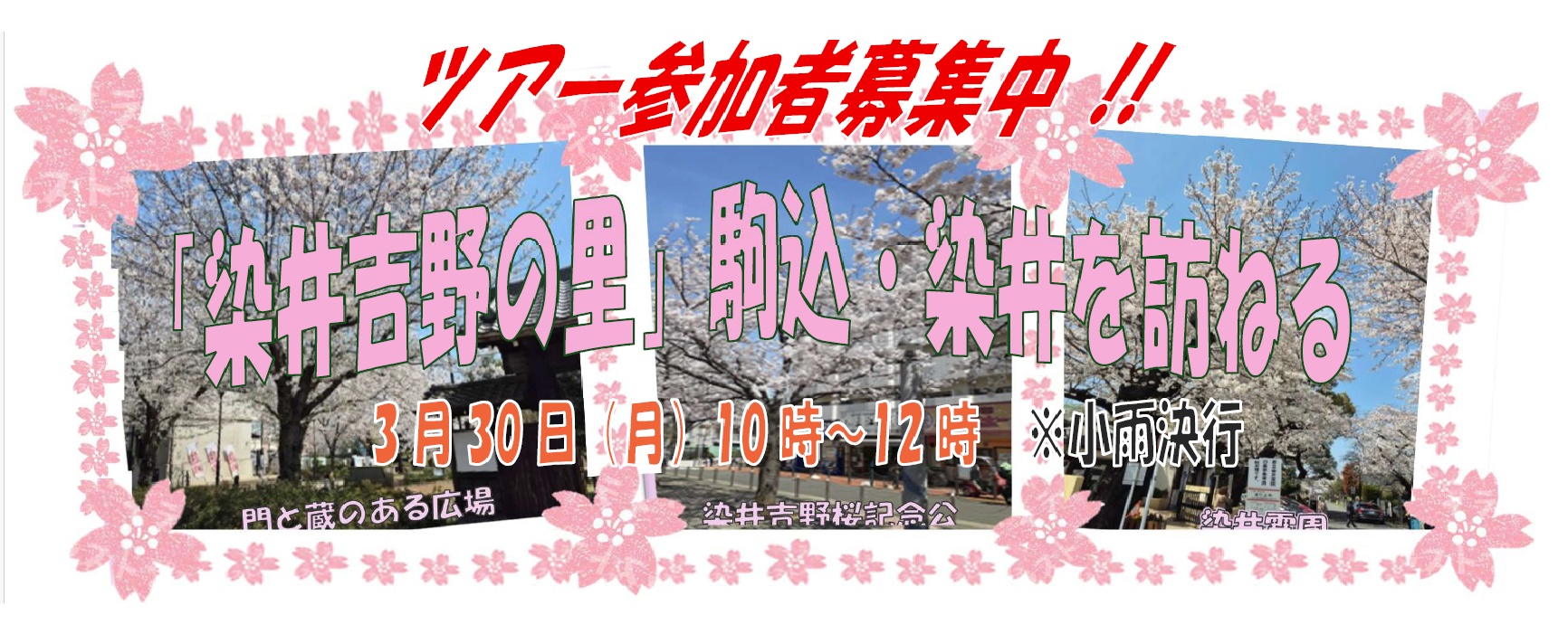 🌸「染井吉野の里」駒込・染井を訪ねる 2026年2月4日 桜といえば「染井吉野」その発祥の地を巡るお花見ツアーです。 📷 開催日時:3月30日(月)10時~12時 📷 集合時間:9時時45分 ※小雨決行 📷 集合場所:JR駒込駅北口交番横「染井吉野桜記念公園」 📷 申込〆切:3月13日(金)📷 詳細は開催予定のツアーはこちらをご覧ください。📷 参加申込は個人用お申込みフォームからお申込みください。