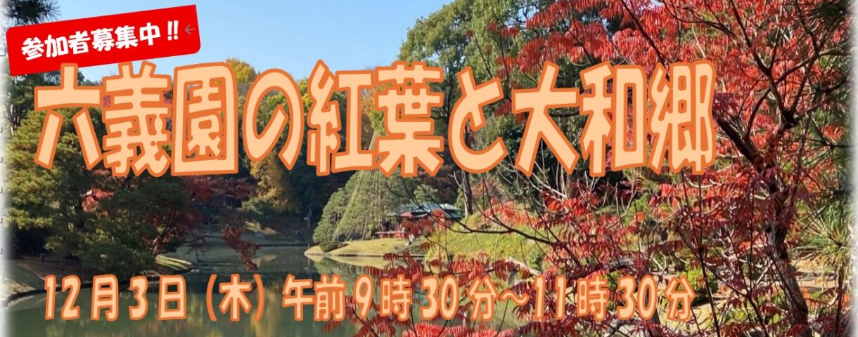 12月4日(土)は『大名庭園「六義園」の紅葉観賞と大和郷』をご案内します。募集はホームページと「広報としま」に掲載をしますので、もう少しお待ちください。ご応募、よろしくお願いします♪♪